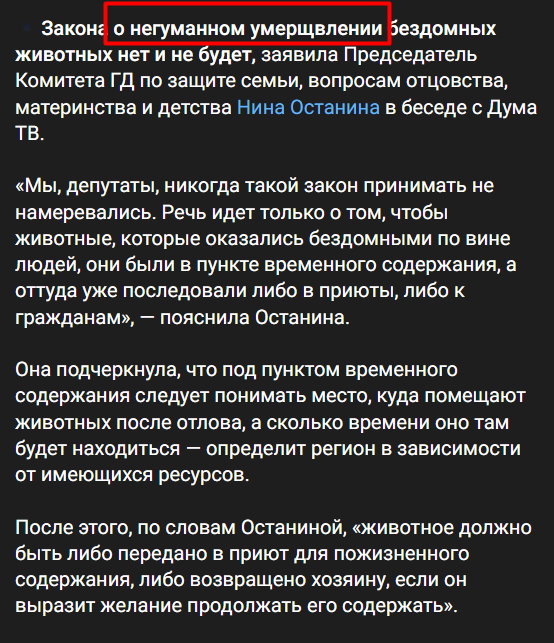 О чём говорит Нина Останина? О том, что собак на улицах ядом травить, отсреливать, лопатой забивать (или что там еще зоошиза придумывает) никто не разрешит. Только усыпление.