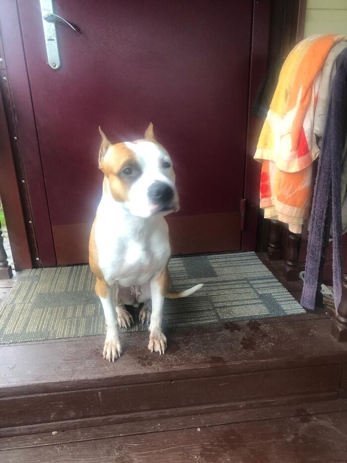 Видно что стафф домашний, надеюсь хозяева ее ищут, а не избавились таким жестоким способом, зимой эта особь на улице не выживет :(