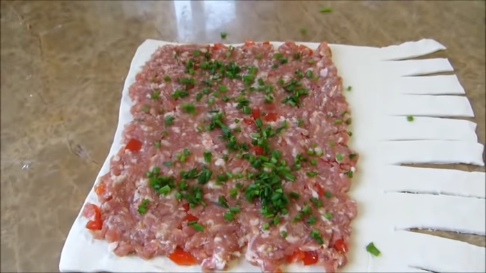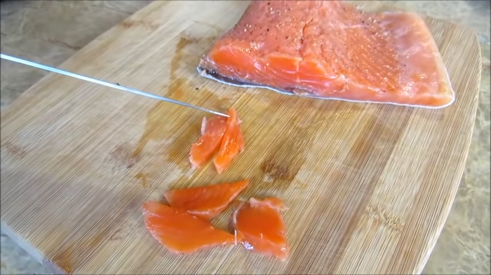 Начнем с мяса. Куриную грудку порежем на пополам и каждый такой кусочек на тонкие ломтики. Отбиваем кусочки деревянным молотком, с двух сторон.