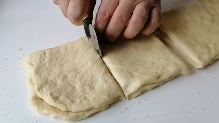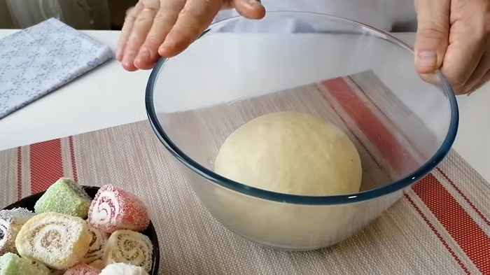 Дальше заводим тесто, кстати делаю его на минералке и сметана. Тесто сегодня нам понадобится для двух рецептов. Соединяем муку, сметану, минералку, желток, щепотку соли и ложечку растительного масла. Готовому тесту даем отдохнуть (отлежаться) в пакете.