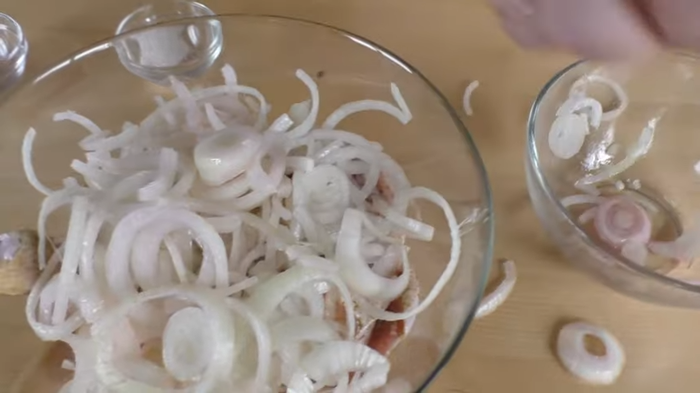 Отдельно маринуем лук (порезанный кольцами), здесь все просто - щепотка сахара и ложка (две) уксуса. Отправляем лук к мясу, хорошо перемешиваем и оставляем минимум на пару часов (лучше на ночь).