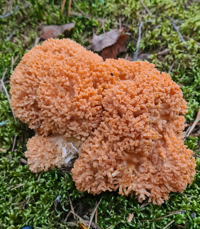 Здоровенный коралл, растущий посреди мха и черничника, около 15 сантиметров в диаметре.