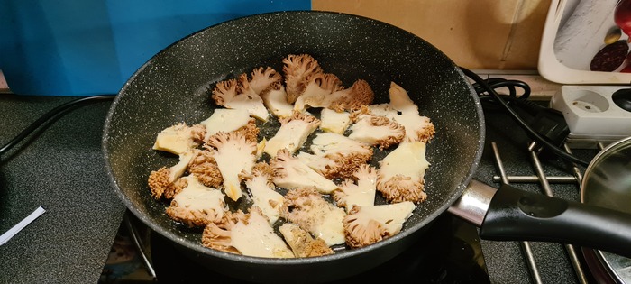 Нарезал рамарию на пластинки. На срезе она нежно-розового цвета. Только ножка местами была более тёмной и горчила, а заодно и хрустела - гриб пророс через песок и нахватался. Но в очистки пошло совсем немного.
