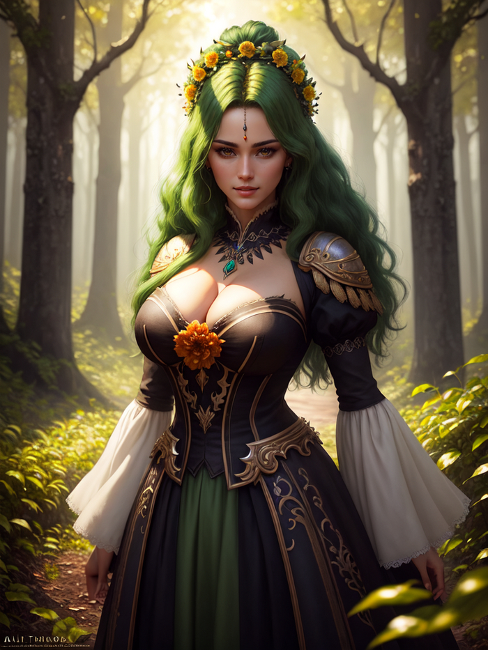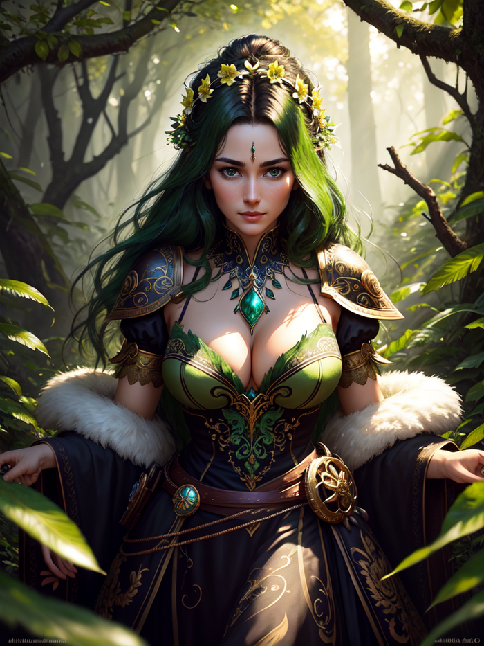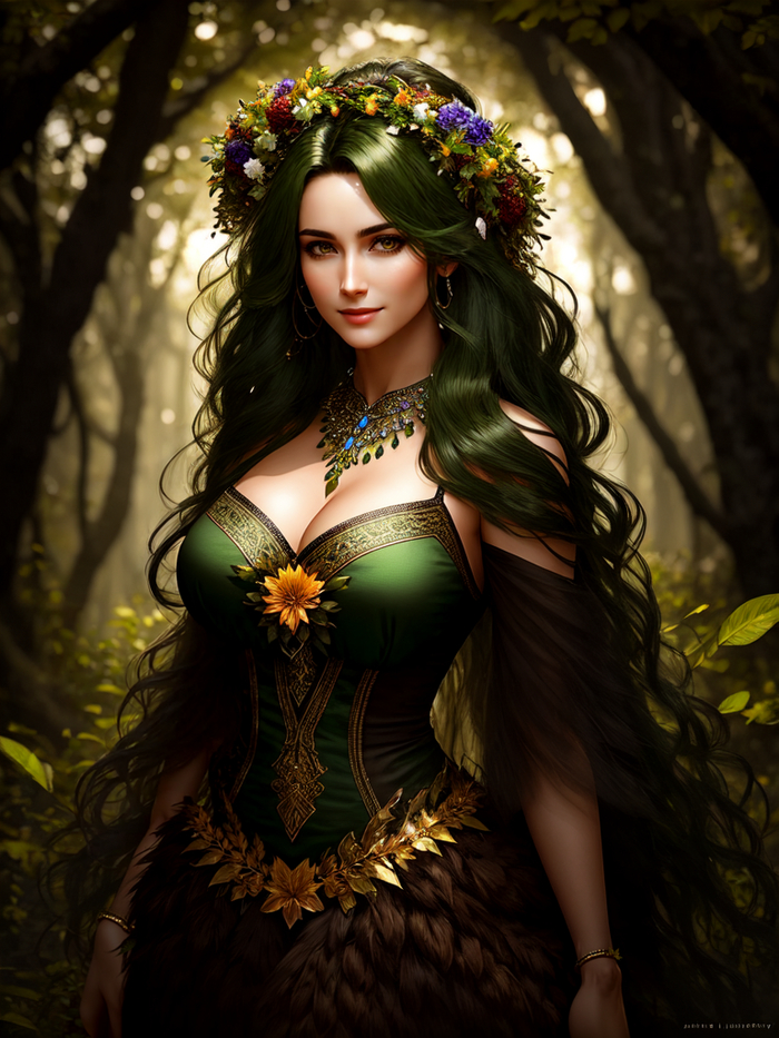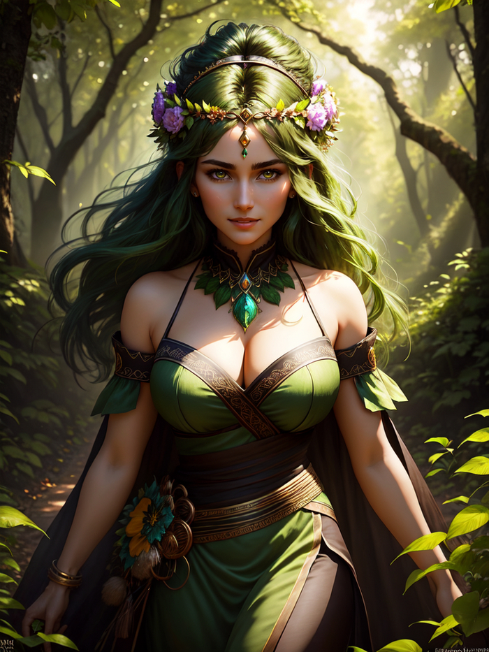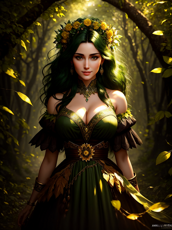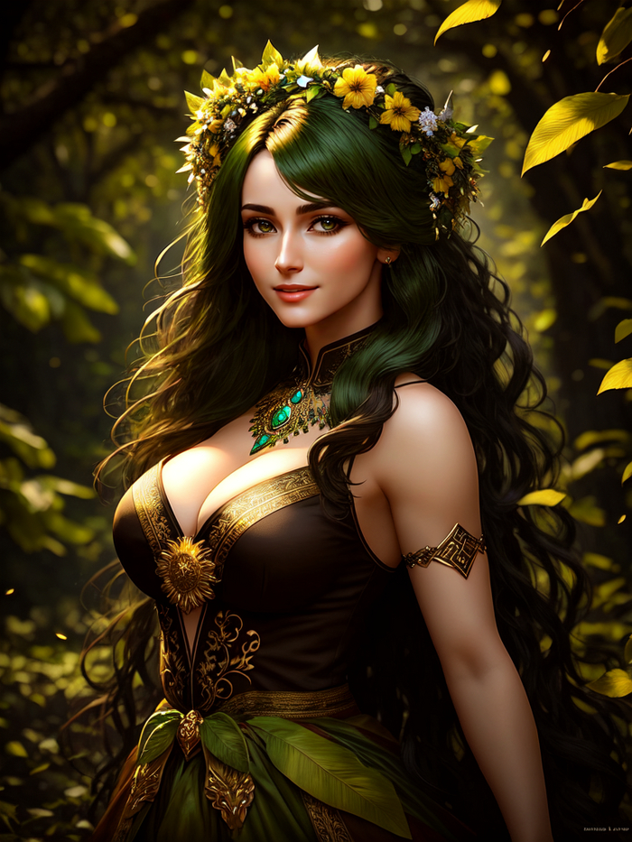 splash art of an enchanting earth spirit druid, dark brown and green two-tone hair, yellow eyes, dress made out of leaves in the (style-swirlmagic:1.1),( swirling leaves magical:1.1) around her, blurry_background, breasts, smile, cleavage, flower crown, natural lighting, windblown hair, looking_at_viewer, solo, highly detailed 8k character concept portrait studio lighting by Annie Leibovitz and Steve McCurry octane render trending on artstation made in Maya 4K high quality digital painting dramatic lighting