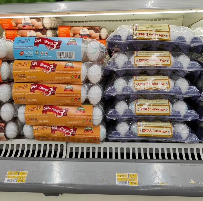 Яйца 30 штук примерно 32 дирхама, 660 рублей, 8,7 доллара. Упрощённо 1 яйцо стоит 1 дирхам или 20 рублей, 0,27 доллара.