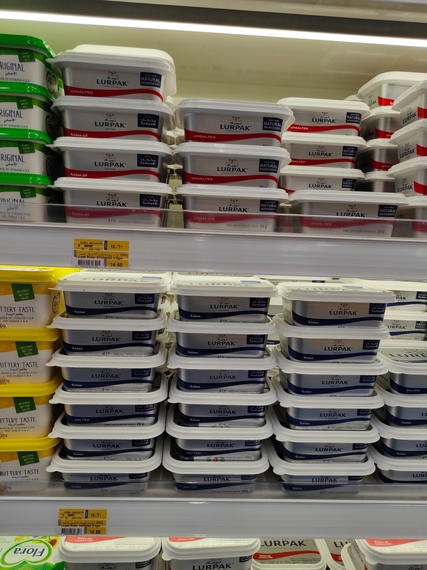 Я так и не понял, является ли продукция с фото 100% маслом (сам масла не ем), но по упаковке, внешнему виду и надписям «солёное»/ «не солёное» должно быть масло. Пачка на 250 грамм стоит 4,35 дирхам, 300 рублей или 4 доллара.