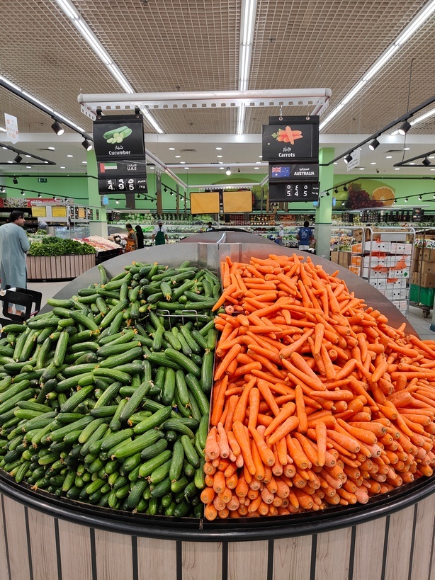 Местные тепличные огурцы стоят 4,95 дирхама за килограмм, это 100 рублей или 1,35 доллара. Морковь привезли из Индии, её стоимость 5,45 дирхам за килограмм, 112 рублей или ~ 1,5 доллара.