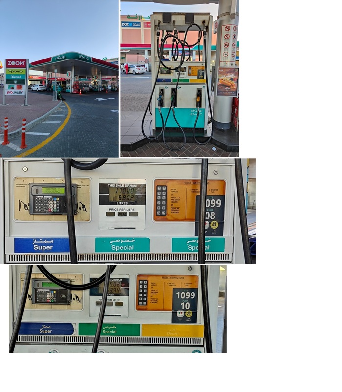 Стоимость бензина я посмотрел на заправке сразу за супермаркетом. Заправка предлагала 2 сорта, стоимость которых почти не отличалась. Бензин Special стоил 2,93 дирхама, бензин Super 3,05. То есть литр бензина в Эмиратах стоит около 3 дирхам.