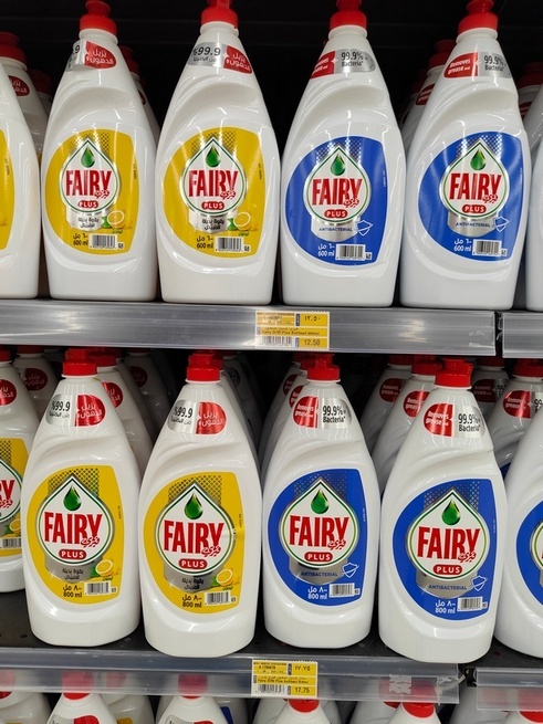 Бутылка Фейри на 600 мл 12,5 дирхам, ~ 255 рублей, ~ 3,4 доллара, на 800 мл - 17,75 дирхам, ~ 364 рубля, ~ 4,8 доллара