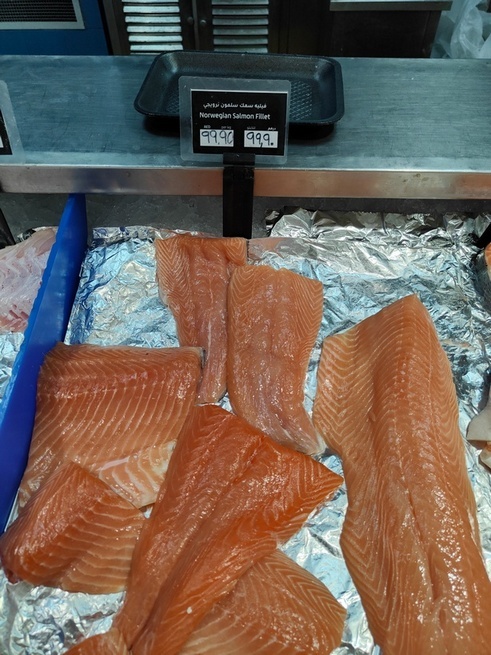 Филе лосося 99,9 дирхам, 2050 рублей или ~ 27 долларов.