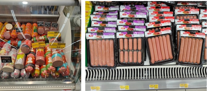 Колбаса от 25,5 дирхам за килограмм, 523 рубля или ~ 7 долларов, сосиски почти в 2 раза дороже: 22,5 дирхама за 0,5 кг., это 460 рублей или 6,1 доллар (кликайте на фотку, чтобы увеличить).