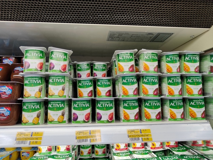 Йогурт Активиа, 2,1 дирхама за упаковку 125 грамм, 43 рубля, 0,57 доллара