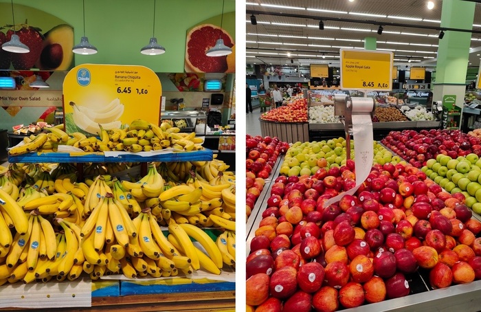 Самые недорогие яблоки (к слову, из Британии) 8,45 дирхама за килограмм, ~ 174 рубля или ~ 2,3 доллара. Подчеркну, что это действительно самые недорогие яблоки. Я видел яблоки из ЮАР, Польши, которые стоили в 2 раза дороже.