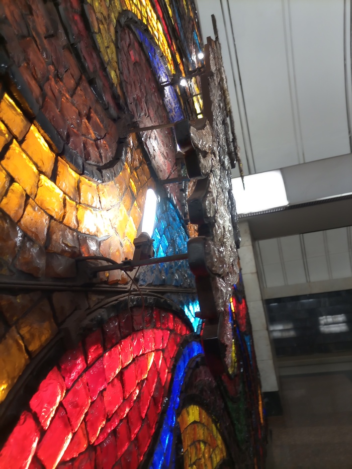 И как всё же странно устроена жизнь! Сегодня спускаюсь на станцию метро "Дубровка", и в ожидании поезда смотрю в даль перрона. И что-то щелкнуло в голове. Уж слишком церетелевским показался этот витраж: