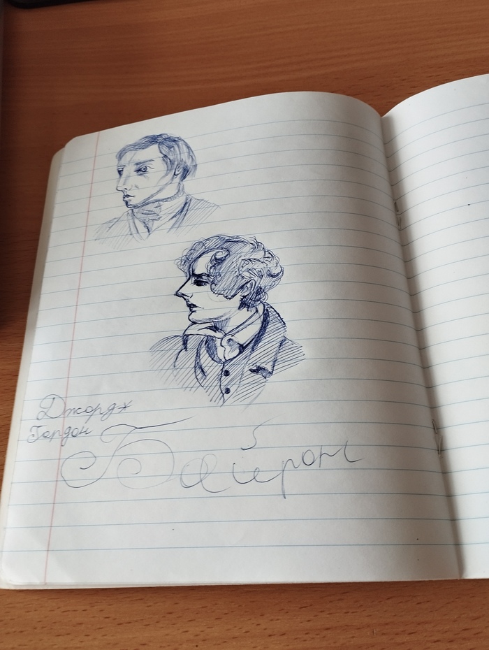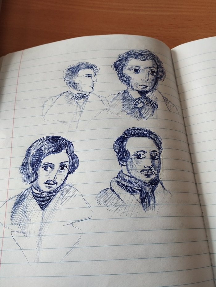 Когда у нас была лит-ра, я рисовала с книги. На обложке были изображены русские писатели русской классической литературы, и некоторые зарубежные авторы. Писатели получились хоть и не очень схоже, но они узнаются. Все изображённые или спят или подготавливаются к урокам😂