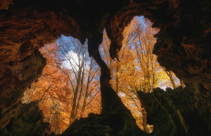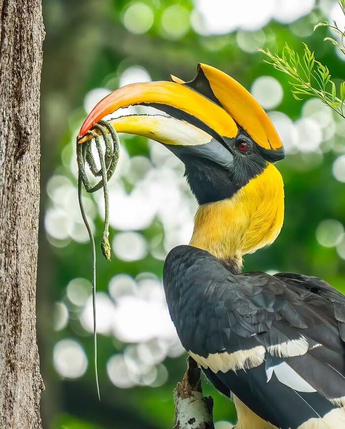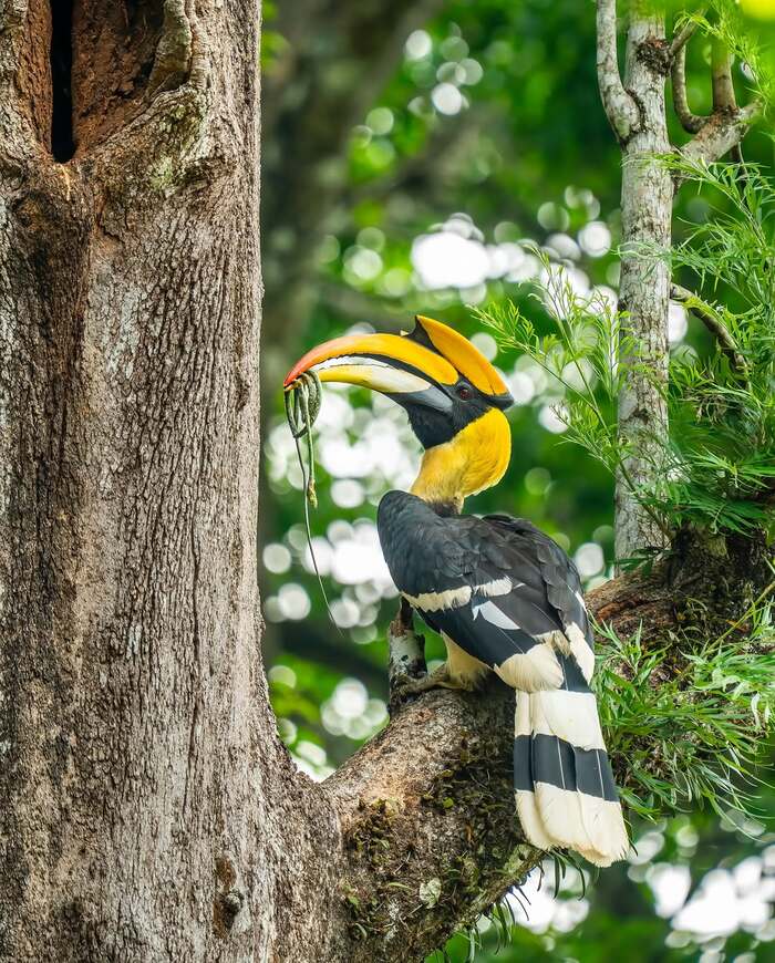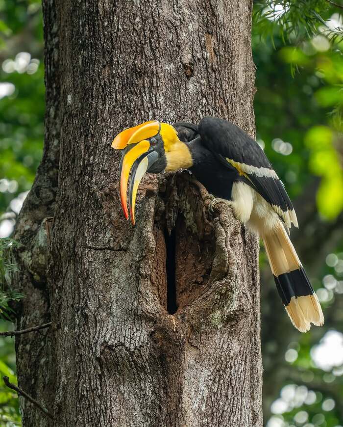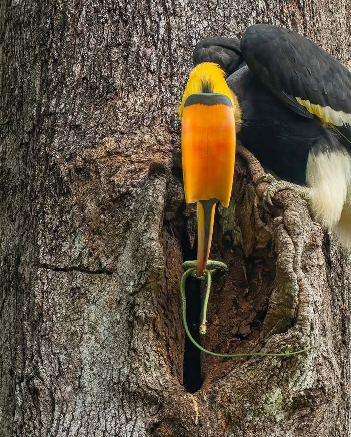Пока самка двурого калао высиживает яйца и растит птенцов, самец снабжает их едой.