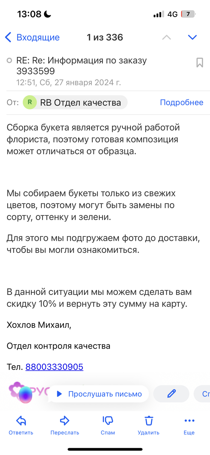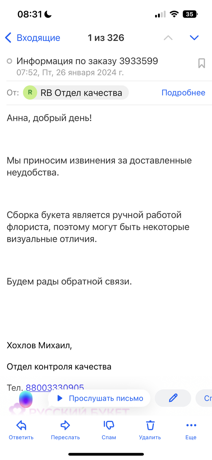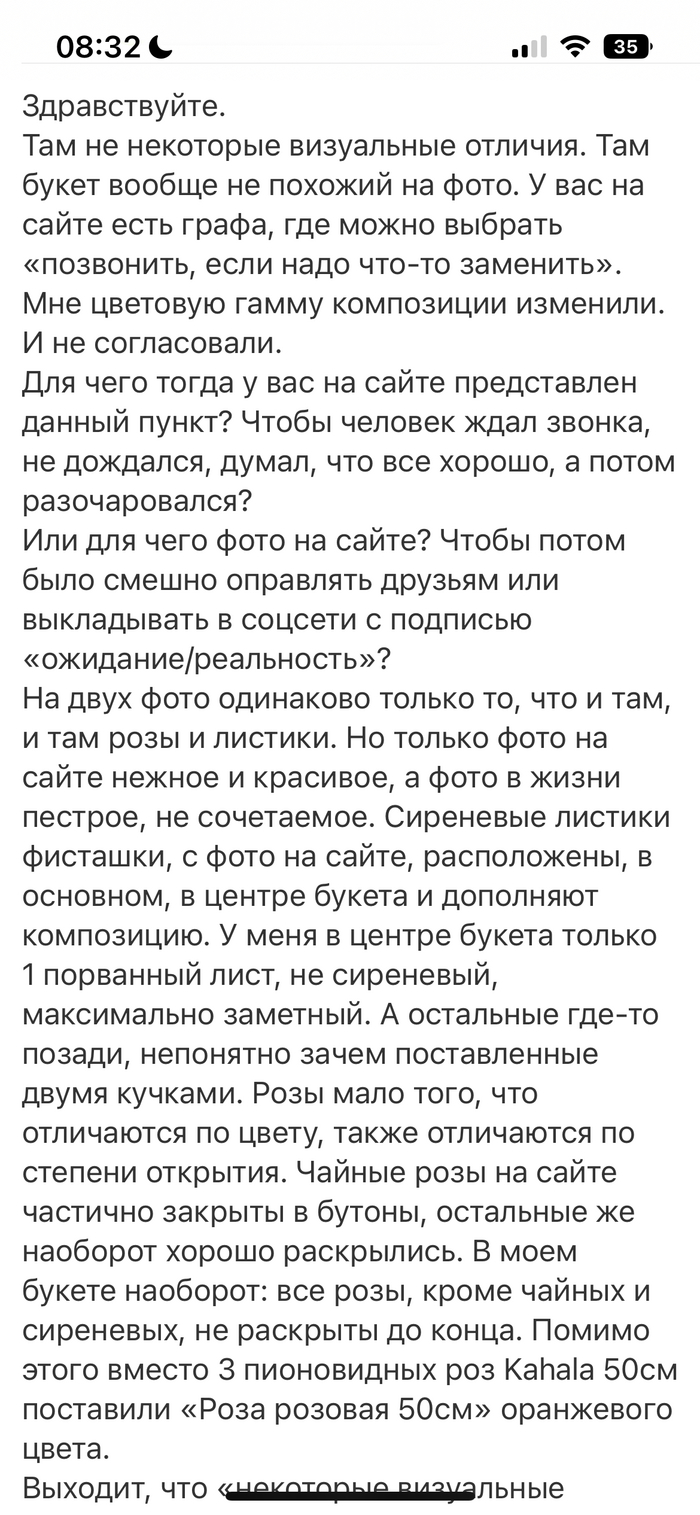 Только я хотела написать, чтобы этот букет поменяли, ибо это абсолютно не то и вообще некрасиво, как мама уже присылает сообщение, что получила букет. Я пишу сразу в службу поддержки (пыталась еще позвонить по вотсапу, но они не берут трубку) и мне сказали, что в течение суток со мною свяжутся.
