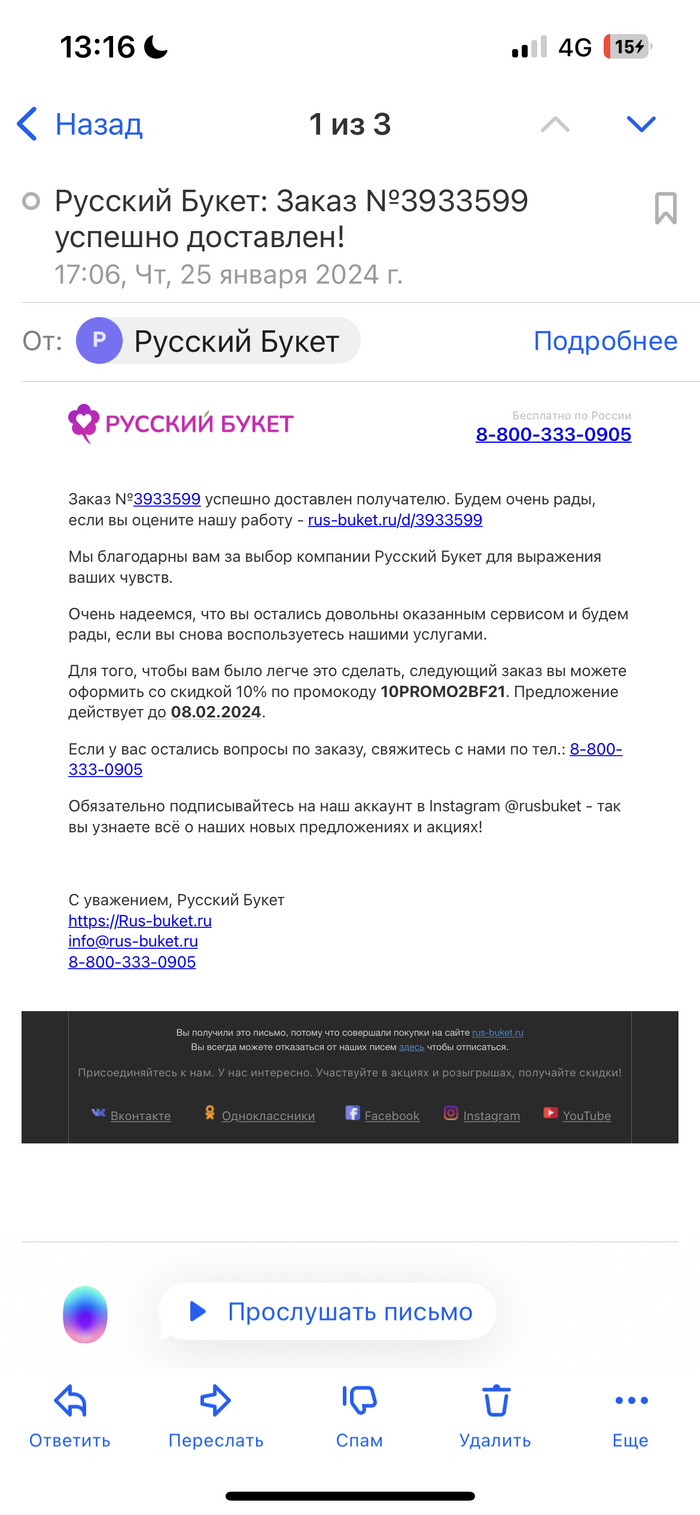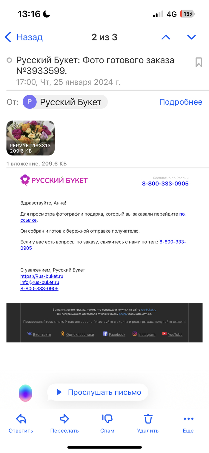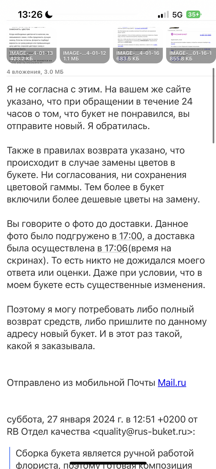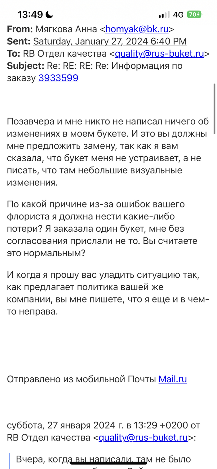 Только я хотела написать, чтобы этот букет поменяли, ибо это абсолютно не то и вообще некрасиво, как мама уже присылает сообщение, что получила букет. Я пишу сразу в службу поддержки (пыталась еще позвонить по вотсапу, но они не берут трубку) и мне сказали, что в течение суток со мною свяжутся.