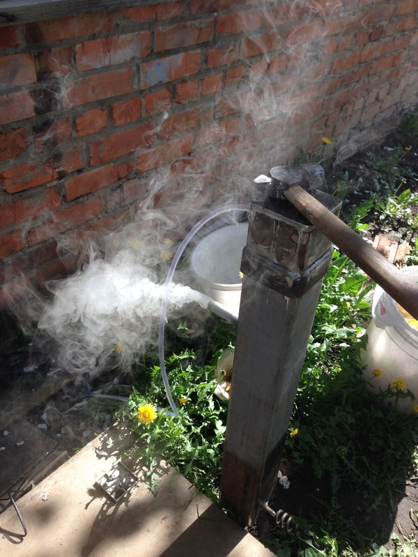 Дымогенератор состоит из 2х частей: справа - камера сгорания и зольник, слева - сборник конденсата и улитка с эжектором. Соединяются муфтой и двумя сгонами.