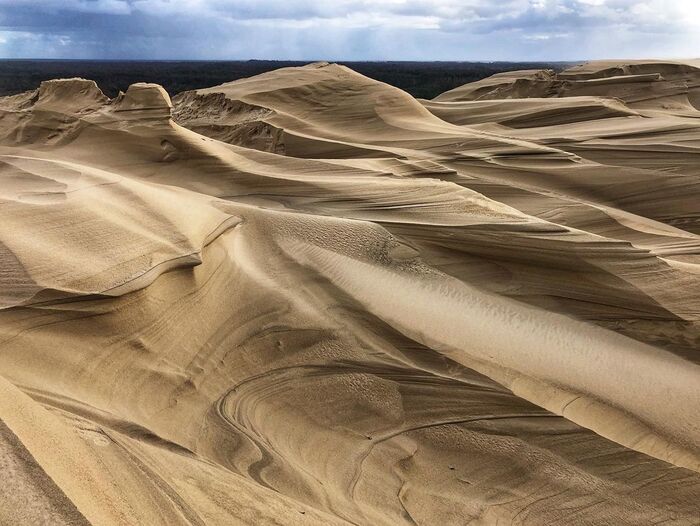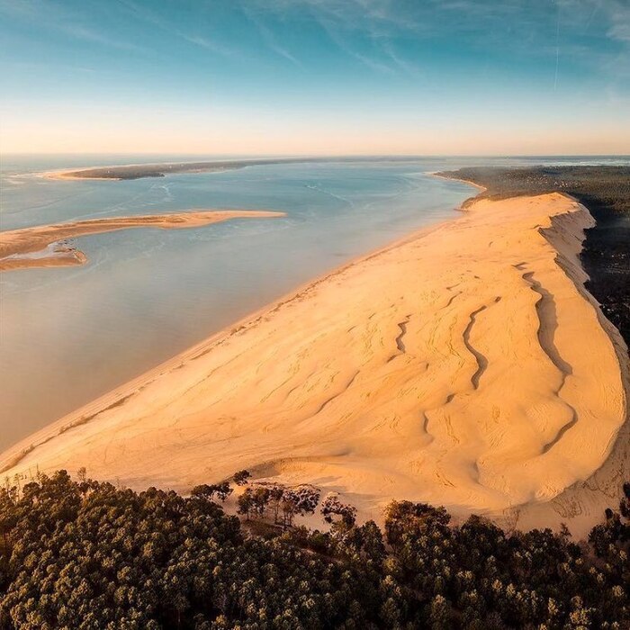 Дюна дю Пила́ (Дюна Пилат) - самая большая дюна в Европе, её высота около 130м, а в длину почти 3 км. Несмотря на свои размеры, дюна образовалась совсем недавно - в XVIII веке, когда недалеко от побережья обрушилась песчаная отмель, и весь песок постепенно стало (и продолжает) намывать на берег. В отличие от обычных гор, песчаные подвижны и быстро меняются. Дюна Пилат постепенно увеличивает высоту и движется от берега, "съедая" окружающий лес.