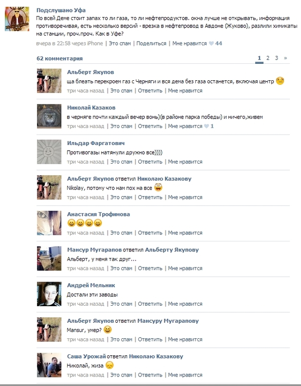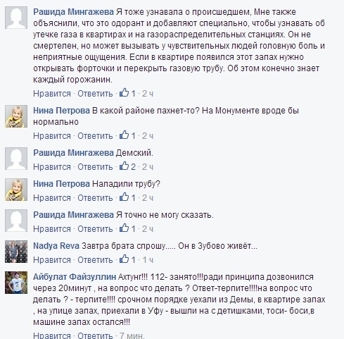 Однако уже 7 НОЧЕЙ подряд, подчеркиваю НОЧЕЙ, жители Демского района (более 70 000 человек), задыхаемся от жуткой вони какого то газа), официальные сми заявляют, что запах связан с перевозкой загрязненной нефтепродуктами почвы, но этот же запах чувствовался и 15.05.2016 еще до официального нахождения протечки!!!!