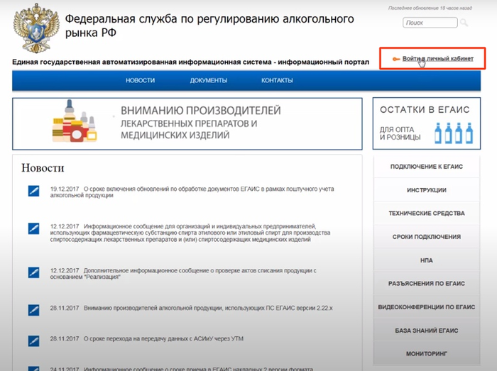 Чтобы зарегистрироваться в ЕГАИС, потребуется войти в личный кабинет на портале egais.ru.