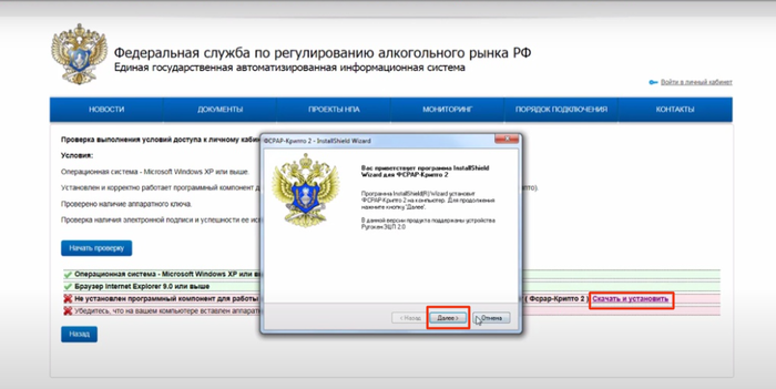 После того, как вы нажмете на значок «Начать проверку», система покажет, все ли условия для подключения выполнены. Если ваш компьютер соответствует нужным требованиям и вы скачали Internet Explorer, то красным будет выделен лишь третий пункт об установке программного компонента «Фсрар-Крипто 3». Он нужен для корректной работы системы. Но ничего страшного, скачать и установить компонент можно прямо по ссылке в конце строчки ошибки.