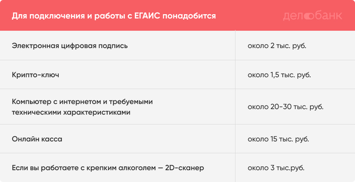 Подключение к ЕГАИС будет стоить около 3-5 тыс. руб. за электронную цифровую подпись и крипто-ключ, но работа в системе может потребовать дополнительных затрат.