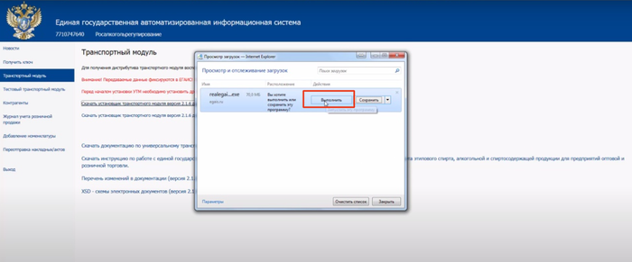 Осталось совсем чуть-чуть. Транспортный модуль — это приложение, которое будет передавать данные от вашей учетной системы на сервер ЕГАИС. Чтобы его установить, в меню нужно выбрать пункт «Установить транспортный модуль», а затем скачать его установщик.