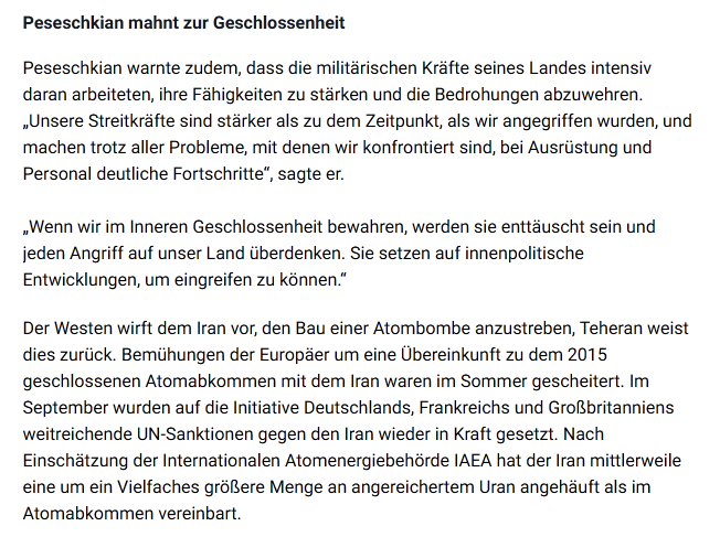 Пезешкиан также предупредил, что вооружённые силы его страны активно работают над усилением своих возможностей и противодействием угрозам. «Наши вооружённые силы сильнее, чем в момент нападения на нас, и, несмотря на все проблемы, с которыми мы сталкиваемся, демонстрируют заметный прогресс в оснащении и личном составе», — заявил он.