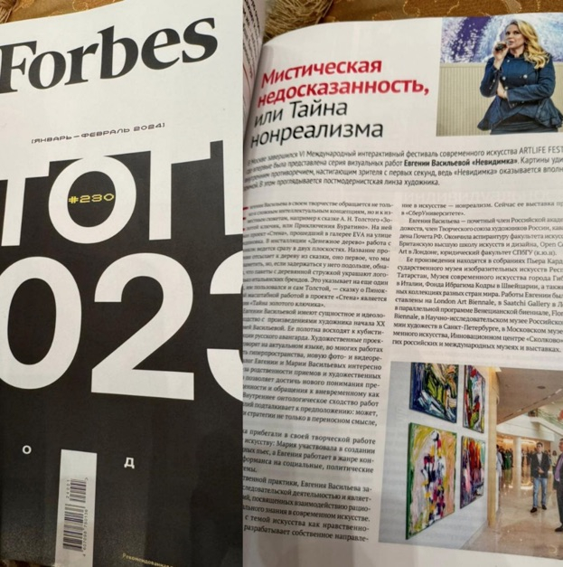 Выпуск журнала Forbes «Итоги 2023» порадовал своих читателей самыми разнообразными материалами, подводящими черту под ушедшим годом. Среди них и публикация «Мистическая недосказанность, или Тайна нонреализма» о творчестве Евгении Васильевой, также известной в мире современного арта под псевдонимом EVA. Автор отметил, что в 2023 году в Москве прошел VI Международный интерактивный фестиваль современного искусства «ARTLIFE FEST 2023», на котором EVA впервые представила серию визуальных работ «Невидимка». Многое из экспозиции можно увидеть и в рамках проекта «Стена», показанного в галерее EVA на Спиридоновке.