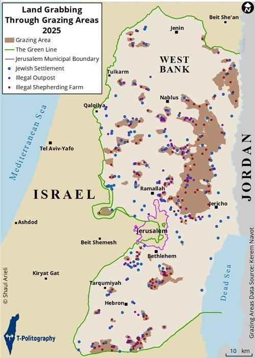 5. В последние годы наблюдается тенденция с захватом земель путём создания незаконных сельскохозяйственных ферм и форпостов на палестинских пастбищных и сельскохозяйственных землях. По состоянию на конец 2025 года, на Западном берегу существуют 151 незаконный форпост и 175 сельскохозяйственных угодий [всё это оккупационная инфраструктура, которую поддерживают власти Израиля и его армия]. Коэн сообщает: правительство оказывает широкую поддержку расширению форпостов и ферм; выдаёт разрешения на легализацию форпостов, финансирует их и даже содействует активному созданию новых ферм; Министерство по делам поселений выделило более 100 миллионов шекелей (32 млн долларов) на поддержку ферм, включая меры безопасности по линии Цахал.