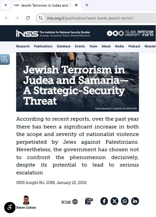 Самый влиятельный аналитический центр в Израиле Институт исследований национальной безопасности / ИИНБ (обслуживает Цахал и действующий режим) признал существование еврейского терроризма. "Согласно последним данным, за последний год значительно возросли как масштабы, так и жестокость националистического насилия, совершаемого евреями против палестинцев. Тем не менее, правительство решило не принимать решительных мер против этого явления", - отмечает бывший офицер разведки и эксперт ИИНБ Рим Коэн.