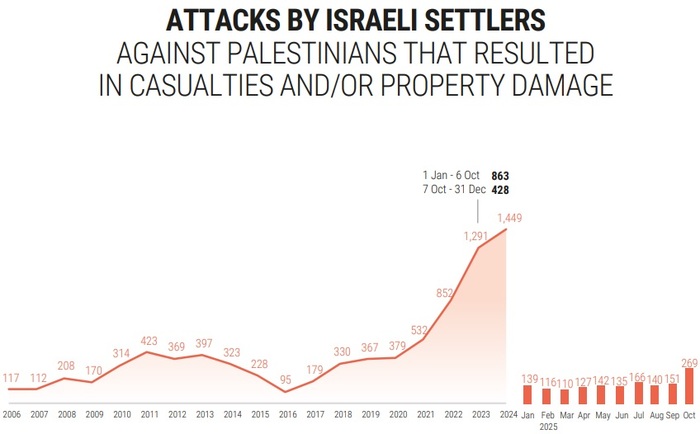 2. Данные ООН более ужасные: в 2024 году задокументировано 1420 нападений на палестинцев (+16%); 2025 год - 1770 (+25%).
