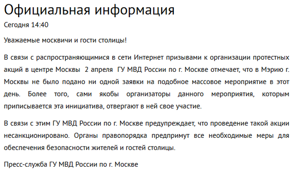 2. Изначально акция была запланирована как несогласованная. Аргументировалось это тем, что "нет смысла просить у власти разрешения на протест против власти" (Да, им похуй на то, что это не разрешение, а согласование для обеспечения безопасности митингующих и обычных прохожих) или как-то так. То есть предлагают идти на заведомо несогласованное мероприятие, на котором полиция будет вязать пришедших на основании 20.2 п.6.1. Опротестовать задержание будет скорее всего нельзя, так как митинг проходивший 26 марта был согласован (см. ПОСТАНОВЛЕНИЕ КС от 14 февраля 2013 г. N 4-П пункт 2.2), в отличие от этого.