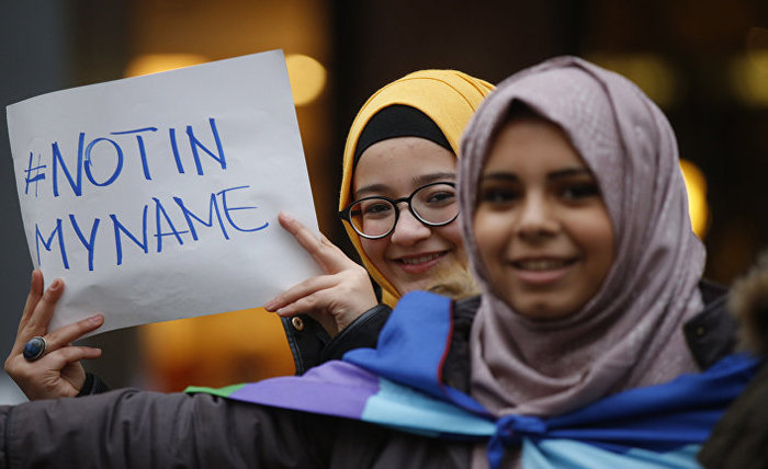 Девушки-мусульманки с табличкой «Не от моего имени» во время акции протеста против терроризма в Милане