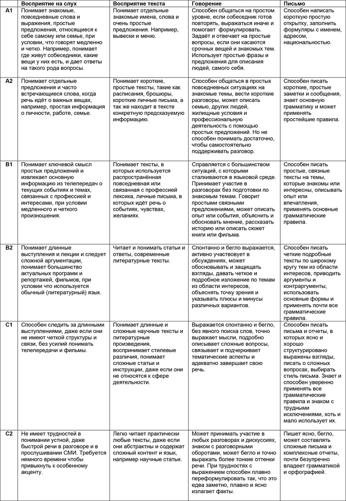 Для тех, кто тоже понятия не имеет, что все это значит, я составила обзорную таблицу для А1 - С2 на основании CEFR.