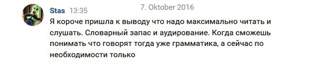 С глубочайшим стыдом заявляю: прежде чем уехать в Германию, я, на протяжении 15 лет, с разной интенсивностью учила немецкий язык. Самое ужасное – это было время, потраченное впустую. Соотнеся мои навыки немецкого на сентябрь 2016 года с вышеприведённой таблицей я осознала, что не было у меня никакого А2. Долгие годы я учила язык и учила его абсолютно неэффективно, я прокачивала грамматику, но мне не к чему было её применять и потому она не усваивалась. У меня был очень маленький словарный запас, я понимала как строить предложения, но мне не из чего было их строить. Я обладала околонулевым говорением и пониманием на слух, потому что убеждала себя, что если смогу грамотно составлять предложения, то и говорить начну сама по себе. К сожалению, так это не работает.