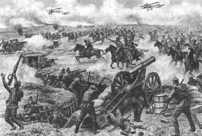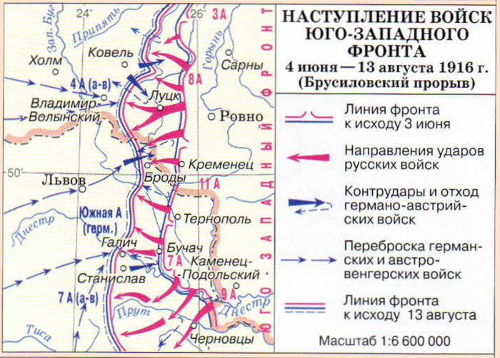 Восточный фронт в 1916 году в ожесточённости сражений ни чем не уступал Западному. Летнее наступление русской армии являлось частью общего стратегического плана Антанты. Начало кампании на русском фронте было назначено на 15 июня, однако гибель французских дивизий в "Верденской мясорубке", а также тяжелое положение итальянцев на Итальянском фронте, оказавшихся под чудовищным натиском войск Австро-Венгрии, заставило русское командование пойти в наступление раньше обговоренного срока. 11 мая 1916 года командующий Юго-Западным фронтом генерал Алексей Брусилов получил телеграмму из штаба Ставки Верховного главнокомандующего, в которой ему ставилась задача в ближайшее время начать наступление в связи с необходимостью оттянуть часть сил противника с итальянского фронта. 4 июня в 3 часа началась артподготовка, которая привела к сильному разрушению первой полосы обороны и частичной нейтрализации артиллерии противника. Перешедшие затем в наступление русские армии прорвали хорошо укреплённую позиционную оборону австро-венгерского фронта сразу на 13 участках. Чтобы закрепиться на занятых позициях и сохранять непрерывность наступления, русская пехота была разделена на "волны атаки". Каждый полк образовывал 4 волны, идущих одна за другой на дистанции 150−200 шагов, интервал между бойцами 5 шагов. Вооруженные гранатами, пулеметами, дымовыми шашками, ножницами для резки проволоки, первые две волны брали первый окоп и, не задерживаясь, атаковали второй, где и закреплялись. Это делалось с учетом тактики противника, который обычно открывал огонь по прорвавшимся и застрявшим на первом окопе солдатам. Затем тяжелые батареи отсекали подход помощи атакующим и мощным контрударом прорвавшиеся истреблялись. Но теперь в каждой роте была штурмовая группа из наиболее ловких солдат. Идя в голове атаки, они гранатами и массированным ружейно-пулеметным огнем ликвидировали огневые точки, расчищая путь наступающим товарищам. Третья-четвертая волны быстро перекатывались через первые две и свежими силами брали третий окоп и артиллерийские позиции. Этот метод потом стал широко использоваться под названием "атака перекатами". После столь удачного наступления русских армий австро-венгерские войска охватила паника, в результате чего было захвачено огромное количество пленных, так как потрясенные австрийцы сдавались каждому, кто мог взять их в плен. На некоторых участках русские армии прорвались вглубь фронта на 60 км, обратив противника в паническое бегство.