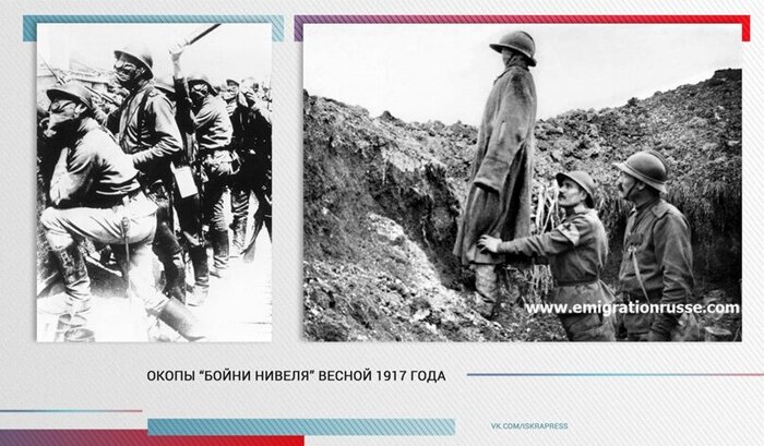 Не только французская армия к 1917 году начинала испытывать возмущение от непрекращающейся ужасной войны и той цены, которую им приходилось платить за ее продолжение. Так русская армия начала трещать по швам еще в конце 1916 года. Жалобы русских солдат были те же, что и у французских: плохая пища, нерегулярные увольнения, беспокойство за благосостояние семейств, оставшихся дома, злость на спекулянтов, помещиков и прогульщиков - тех, кто избежал воинской повинности и теперь получал хорошую заработную плату в тылу, занимаясь обычным делом - и, что было самым угрожающим, неверие в полезность атак собственных войск. Среди солдат вовсю ходили разговоры о немедленном заключении мира, независимо от последствий для государства. Экономическая ситуация в стране также оставляла желать лучшего. Промышленная мобилизация в России, финансируемая огромным расширением бумажного кредита, создала неослабевающий спрос на труд, который спровоцировал огромный приток крестьян в город, в результате чего государственные заводы за время войны увеличили численность рабочей силы более чем втрое. Крестьяне-переселенцы также находили работу на шахтах, где занятость к 1917 году по сравнению с 1914 возросла вдвое, на железных дорогах, на месторождениях нефти, в строительстве. Все это привело сначала к росту заработной платы, а затем и к стремительной инфляции, которая особенно разрушительно повлияла на сельскохозяйственное производство. Крупные землевладельцы продавали землю в обмен на производственные мощности, поскольку не могли позволить себе тройное увеличение заработной платы. К довершению бед в начале 1917 года в России грянули сильные морозы, и в городах возрос спрос на топливо и пищу, чьи запасы быстро иссякли. В марте даже в столице Петрограде запасов зерна на складах оставалось только на несколько дней. В конце концов, именно эта нехватка продовольствия привела к Февральской революции, в результате которой в Российской империи была свергнута монархия.
