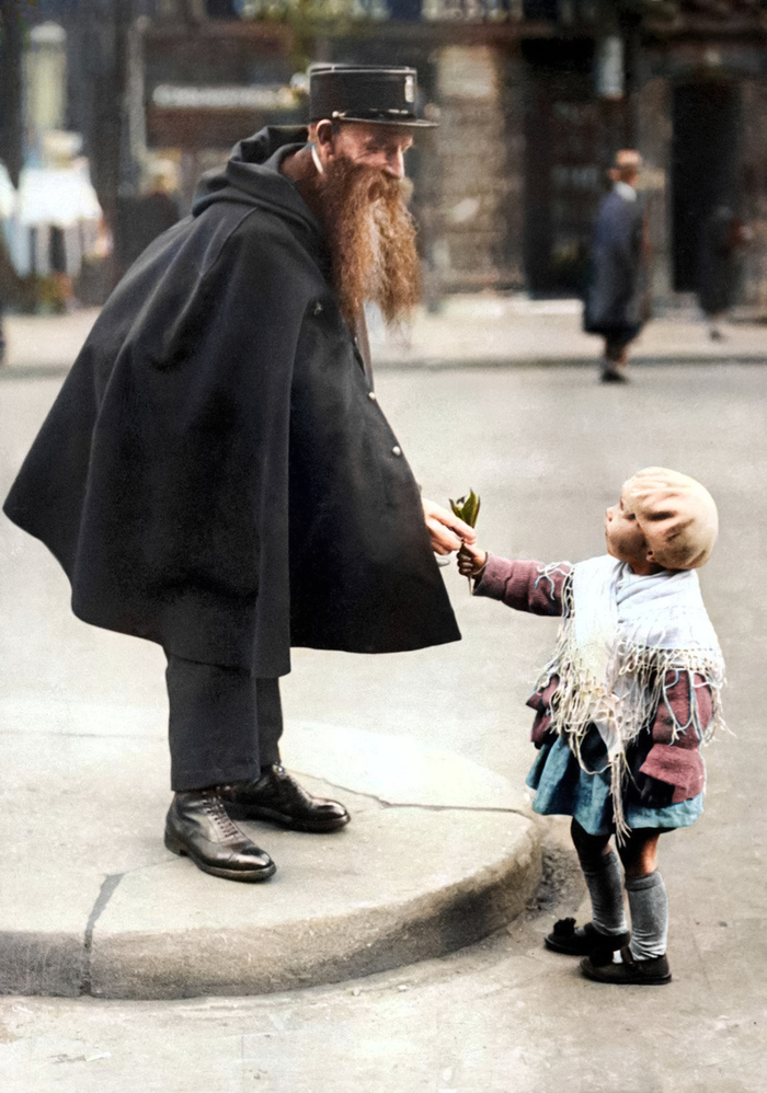 Маленькая девочка протягивает букет лилий полицейскому. Париж, 1920 год.