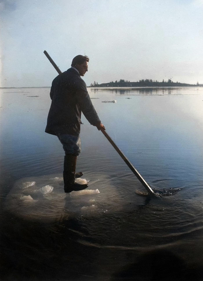 Мужчина стоит на льдине. Подпись гласит: «Безумный Виктор». Грисслехамн, Швеция, 1922 год.