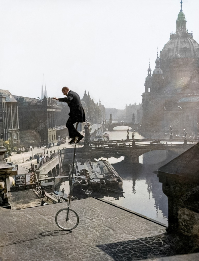 Фред Брэдфорд на одноколесном велосипеде. Берлин, 1921 год.