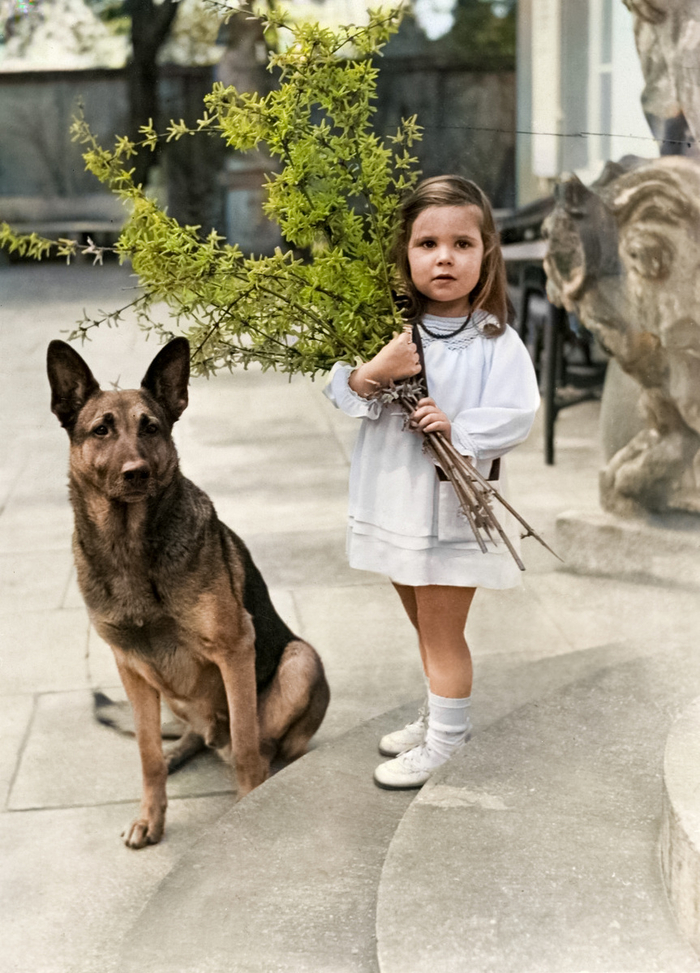 На этом фото — Хельга Геббельс, старшая дочь Йозефа и Магды Геббельс, с собакой Адольфа Гитлера по кличке Блонди. Немецкая овчарка была постоянным спутником фюрера и часто появлялась рядом с семьёй Геббельсов, как на официальных встречах, так и в повседневной жизни.