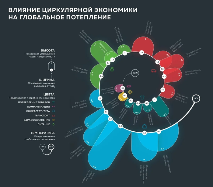 В целом трансформация сектора может сократить как минимум 11 миллиардов тонн выбросов парниковых газов в год. Другие перспективные направления — оптимизация транспортных систем и землепользования, а также снижение потребительских аппетитов. Чтобы наглядно продемонстрировать возможности циркулярной экономики в борьбе с глобальным потеплением, эксперты создали образ расширяющейся спирали: от угрожающих +3,2С0 до относительно безопасных +1,8С0.