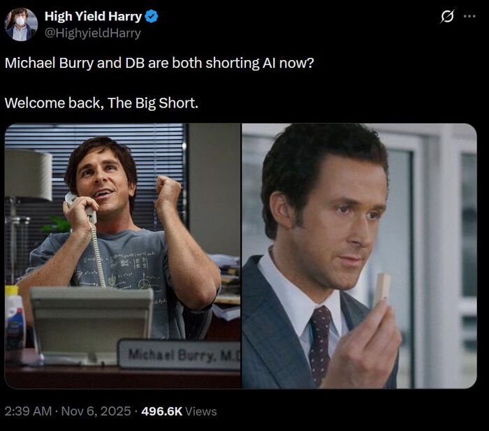 🐌 Хедж-фонд Scion Asset Management Майкла Бьюрри раскрыл данные о своей здоровенной ставке через опционы на обвал котировок Nvidia & Palantir. Параллельно с этим появилась информация о том, что Deutsche Bank ищет возможность захеджировать предоставленные AI-компаниям займы на строительство дата-центров путем… правильно, покупки пут-опционов на всё те же AI-компании.