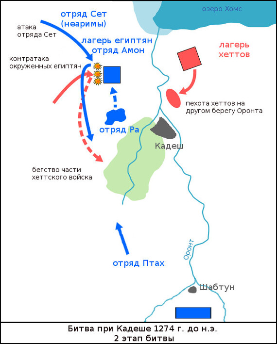 Атаку хеттов египтяне встретили достойно, и попытались прорваться на запад, но успеха эти попытки не принесли. У египетского войска было преимущество в виде копьеносцев, которые строились подобно эллинской фаланге. У хеттов в этом бою копьеносцев не было, что сыграло на руку египтянам, ведь вооружение хеттов было лучше, чем у египтян (напомню, что хетты умели делать железные доспехи и оружие, причём изготовление железа являлось государственной тайной, в то время как в египетской армии металлические доспехи среди пехотинцев распространены не были). Встретив сопротивление с запада, главные силы египтян повернули на восток и сильным ударом сбросили в реку находившиеся там силы противника. А на противоположном берегу Оронта в это время стоял в бездействии восьмитысячный отряд хеттской пехоты. О чём они думали? Видимо Муваталли II был братом по разуму Рамсеса II.