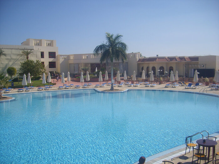 Если говорить об архитектуре, то этот отель единственный из наших египетских, в котором почти всё было в асфальте и бетоне, с небольшими лужайками у корпусов. Корпусов так много, что мы первое время плутали, в поисках своего номера. Между корпусами воткнуты несколько бассейнов и большая аквазона в конце территории с аквапарком и детскими бассейнами и пунктом выдачи полотенец. Причём при смене пляжного полотенца больше чем 1 раз в день, тебе могли высказать недовольство.