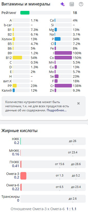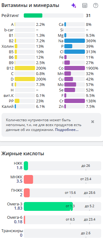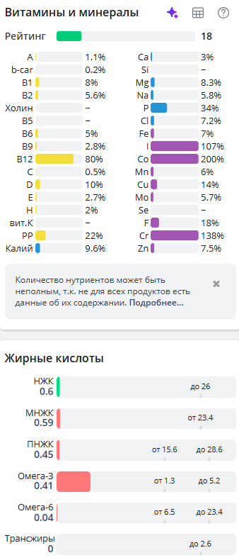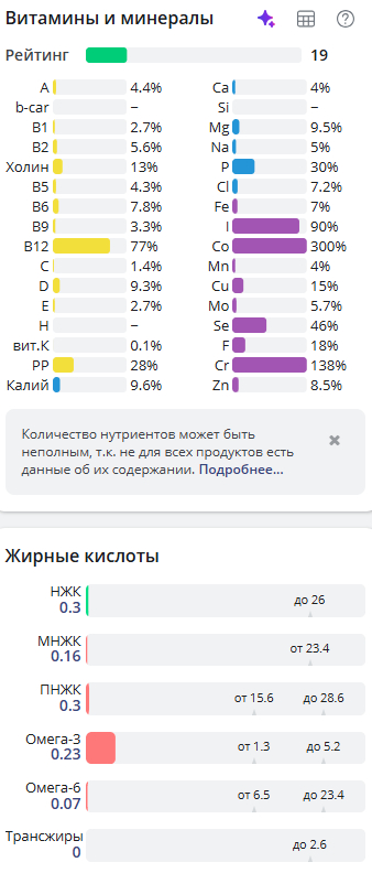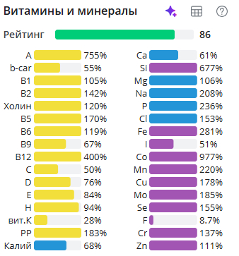 Ну и традиционно разбивка по витаминам и минералам, так как меня всё равно спрашивают, что за калькулятор, указываю источник https://health-diet.ru/ (не реклама)