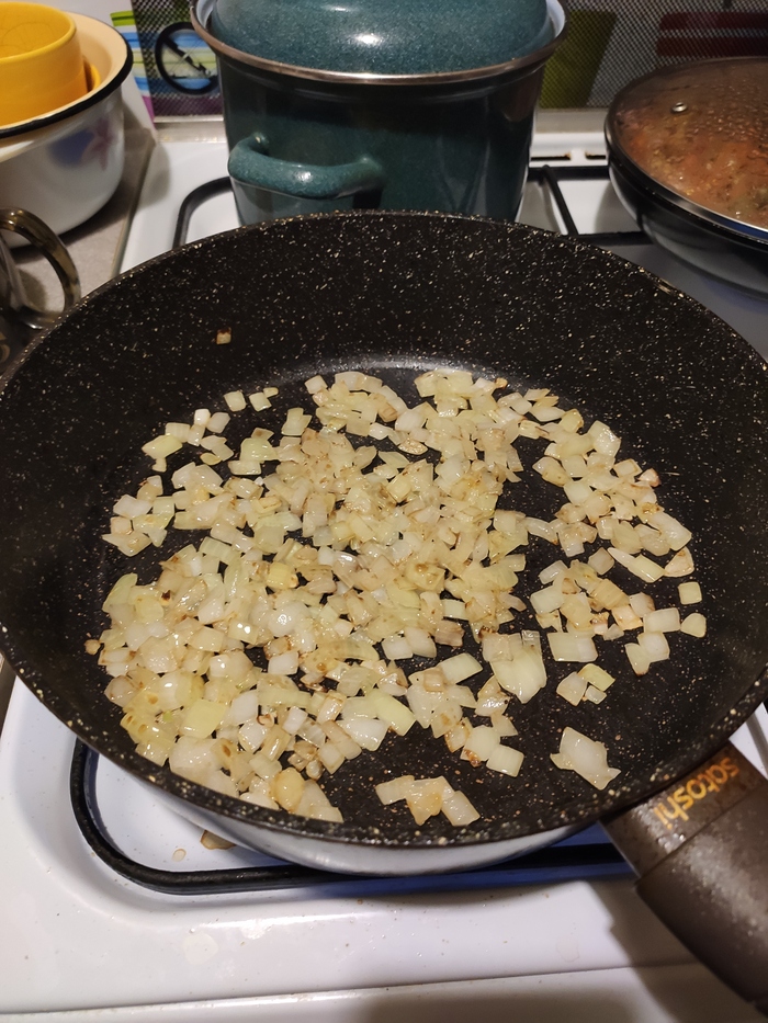 Режем лук, обжариваем его и добавляем в суп (время 17:27):